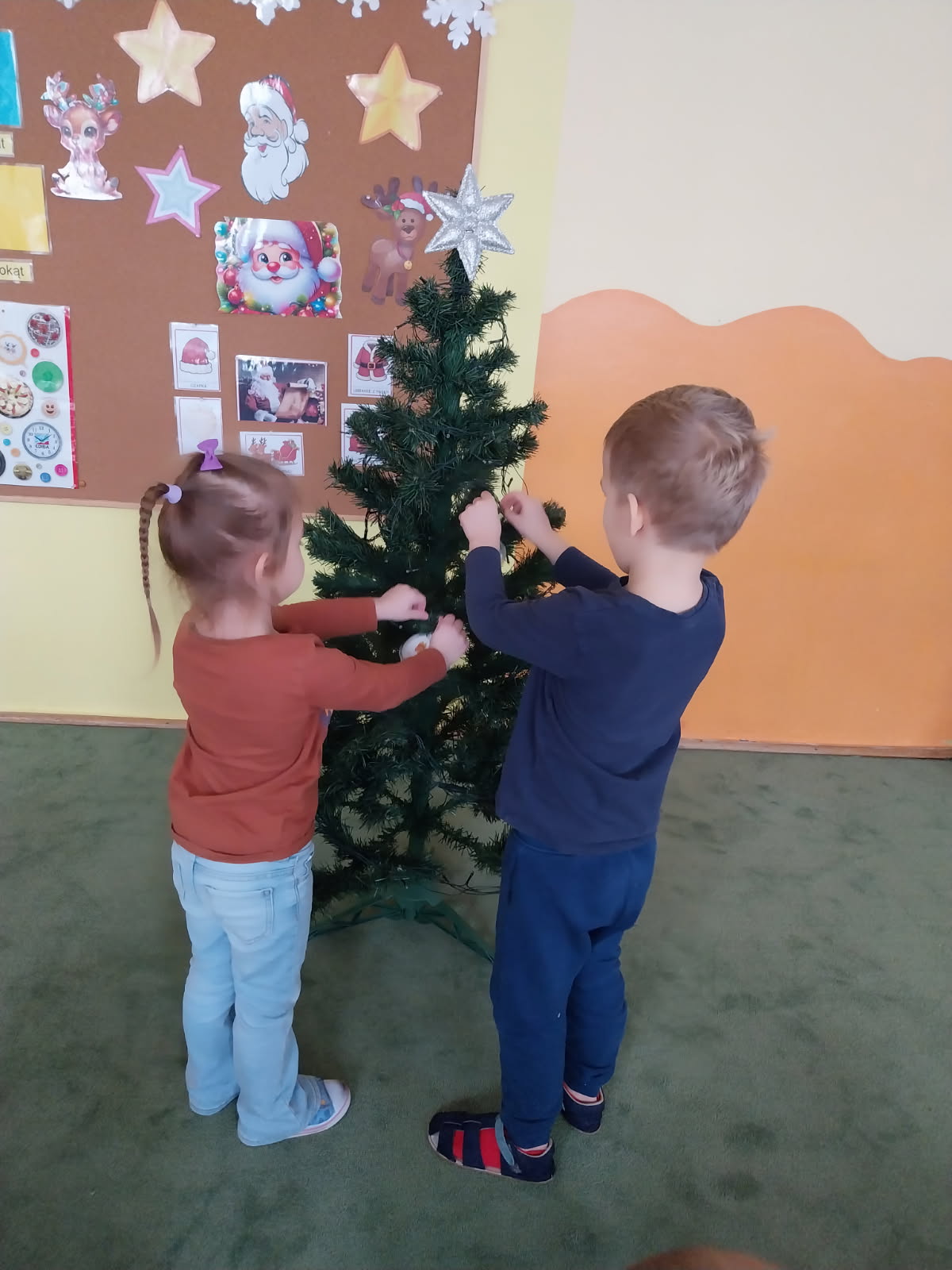 5. 12 dzieci z grupy Pszczółki przystąpiły do zawieszania na choinkę ozdób i bombek, które przyniosły z domu. Wspólne dekorowanie sprawiło im wiele radości i wprowadziło wszystkich w świąteczny nastrój. Dziękujemy serdecznie Rodzicom za podarowane ozdoby na choinkę.